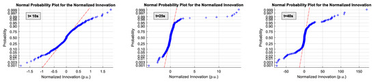 Probability plots for the normalized innovation in different instants: (left) in a stationary condition; (middle) with multiple gross errors; (right) during a loss of generation event.