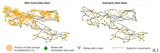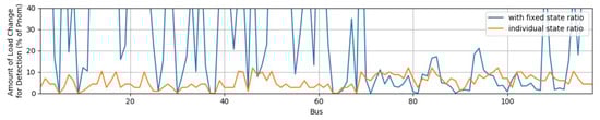 Locational aspect of sudden load change detection with two different state covariances tuning: the first with a fixed state ratio for all buses and the second with an individual level of state ratio for each bus.