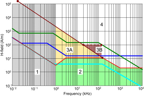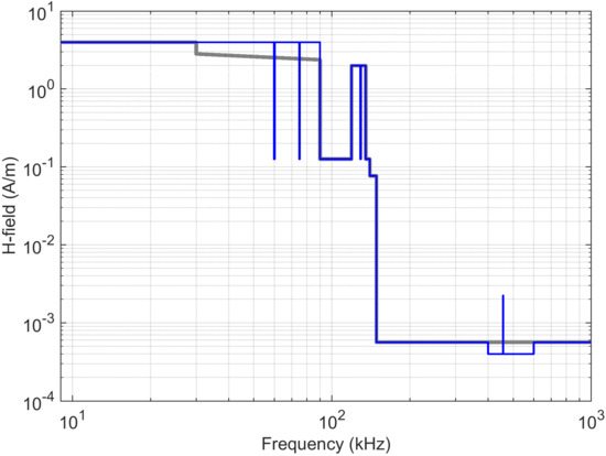 Short-Range Devices (SRDs) of the inductive type, excluding wireless power charging and telemetry for implantable devices as per EN 300 330 [29] (thick grey) and EU Decision [30] (blue): H-field limits are extrapolated to 1 m from the given 10 m values by adding 60 dB, as per Annex H of the EN 300 330.