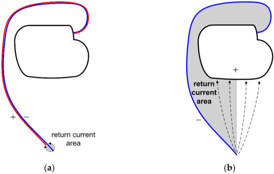 Scheme of a pacemaker and electrodes deployment: (a) bipolar, where the flow of stimulation return current is limited to the uncovered part of the electrodes; (b) unipolar, with a return current flow through the whole cardiac tissue back to the PM body and thus a larger capture area for differential-mode EMI.