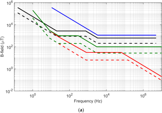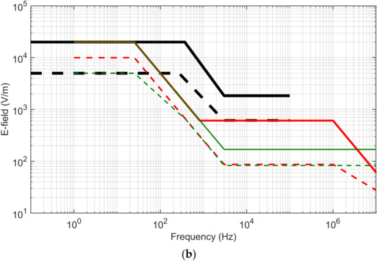 Immunity test levels and methods, as per applicable EMC standards, are discussed later in Section 3.2. The situation with respect to human exposure limits has evolved, in that with older lower reference levels, it could be stated that compliance to the latter was a sufficient condition; newer reference levels are less restrictive and there is no absolute coverage for the entire frequency interval (besides the already commented static field), as it will be shown later in Figure 6.
