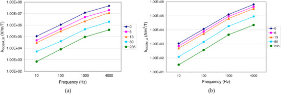 | B-Field [mV/m/mT] | E-Field [mV/m/(kV/m)] | B-Field [(mA/m2)/mT] | E-Field [(mA/m2)/(kV/m)] | ||