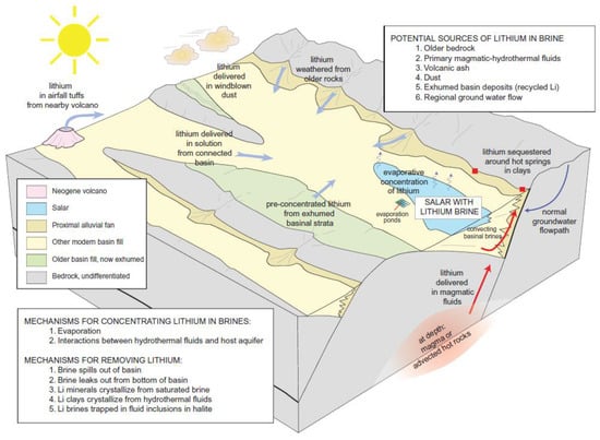 Summary diagram of the geological, geochemical and hydrological features of lithium brine [9]. Lithium can be found concentrated in areas subject to volcanic influences. Reproduced with permission of the Society of Economic Geologists, Inc. Munk et al. (2016) Chapter 14: Lithium brines: A global perspective, Reviews in Economic Geology, v. 18, 339–365.
