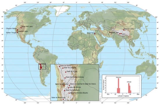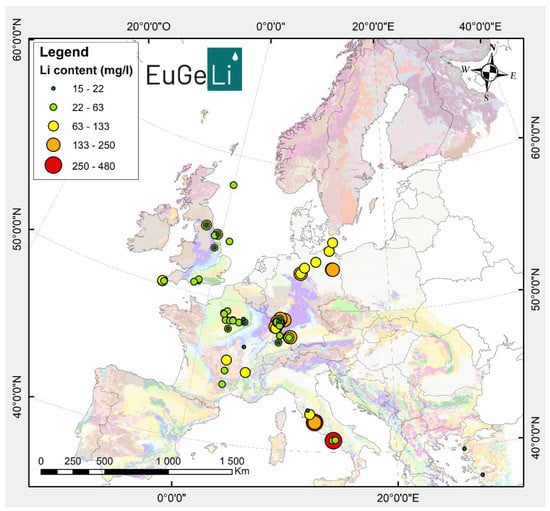 Lithium has a low density of 0.53 g/cm3, an ionic charge of +1, and an ionic radius of 0.79 angstrom (Å). For comparison, sodium has an ionic charge of +1 but a larger ionic radius of 0.99 Å, and magnesium has an ionic charge of +2 and a smaller ionic radius of 0.72 Å [9]. Lithium is a lithophilic element (i.e., an element that forms silicates or oxides and is associated with the Earth’s crust) that concentrates in hydrothermal fluids and therefore can be found concentrated in areas subject to volcanic influences (Figure 1) [9]. In solution, lithium occurs as soluble, positively charged lithium ions (Li+).
