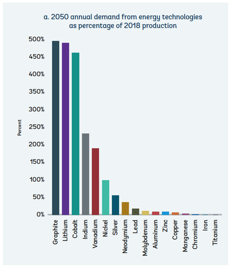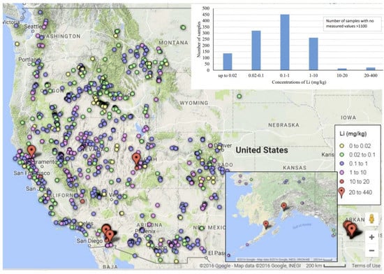 Lithium is a light and reactive metal that is the principal component in one of the most promising forms of high-energy-density batteries [1,2,3]. Current technology for all-electric vehicles is based on lithium-ion batteries and electric vehicles are expected to gain an ever-increasing share of the car market, so lithium demand and production are expected to grow proportionately with vehicle demand [1,2]. In addition to use for electric vehicle batteries, lithium batteries are slated for used in grid-scale storage for intermittent renewable energy generation such as wind and solar [4]. Lithium is also a critical component for ceramics, glass, metallurgy, air treatment products, pharmaceuticals, and polymers [4]. Lithium is used to make alloys with other metals including lead, copper, silver, magnesium, silicon, and aluminum. The alloys most commonly used in aerospace applications are lithium–aluminum alloys containing 1–3 weight % of lithium. Lithium–aluminum alloys are reported to generate weight savings of 5%, increased stiffness up to 7%, and increased strength of up to 30% relative to non-lithium-containing aluminum alloys [5]. Due to this variety of uses, lithium is on the list of critical materials necessary for the economy and security of the United States and was the focus of recent executive orders relating to critical minerals and relevant supply chains [6,7,8].