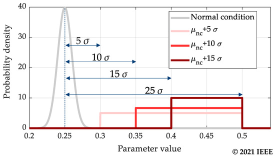 Pabnormal are used for this should be selected by domain experts so that the manipulation results in realistic abnormal-condition types. It is not possible to derive the statistically meaningful parameter distributions from measurements as it is often the case that only small databases of abnormal-condition measurements are available. Therefore, the idea behind the abnormal-condition generation is sampling parameter values of the electromechanical model outside the main area of the normal condition’s probability distribution. In this paper, Gaussian distributions are fitted to the parameter values from the database of parameter values (