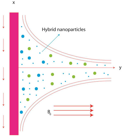 Several techniques for the optimisation of thermal transfer have been used in practice. The recent development in nanotechnology makes it possible to synthesize solid structures at a nano-size. Furthermore, investigators have shown that the suspension of nano-sized solid structures is important in fluids, observing a rise in the thermal conductivity of liquids and noting that fluids with nanostructures behave as suitable coolants. These fluids with nano-sized particles are called nanofluids. The thermal performance of such coolants is optimized due to the dispersion of such nanostructures. Consequently, energy losses can be minimized. Based on this fact, researchers have studied heat transfer in nanofluids and observed a remarkable enhancement in that heat transfer. For example, Masuda et al. [1] presented in the early 1990s the concept of nanometer-sized particles. Choi [2] worked on nano-sized particles in the Argonne National Laboratory of USA and introduced the term nanofluid, a fluid with nano-sized solid structures. Phelan et al. [3] published on the applications related to nanoparticles in fluid during the heat transport phenomenon. Lee et al. [4] devised the strategy for measuring the impact of oxide nanoparticles on the thermal conductivity of fluids. Eastman et al. [5] also conducted a study on enhancing a fluid’s thermal conductivity due to the immersion of nanoparticles in it. Huaqing et al. [6] analyzed the effects of the suspension of alumina particles on the increase in thermal conductivity of a fluid. Yimin and Li [7] published significant outcomes related to the suspension of nanoparticles in fluid and their impact on the effectiveness of thermal conductivity. Phillbot et al. [8] discussed how the dispersion of nanoparticles causes thermal enhancement. Naseem et al. [9] discussed an enhancement in temperature performance, inserting impacts of nanoparticles past a stretching surface via a shooting approach. Nazir et al. [10] investigated the comparative performance of thermal aspects among hybrid nanoparticles and nanoparticles using the finite element method. Koriko et al. [11] performed a bio-convection flow in a thixotropic nanofluid under a magnetic field considering the stretching surface. Ali et al. [12] investigated the consequences of peristaltic flow in a Jeffrey liquid using hybrid nanoparticles along with the slip conditions under the action of an MHD flow. Tian et al. [13] studied 3D configurations of hybrid nanoparticles using the impacts of magnetic fields in fins. Mumraiz et al. [14] performed a study of entropy generation in the presence of hybrid nanoparticles along with a variable heat flux. Awais et al. [15] discussed the impacts of pressure drop in thermal energy including nanofluids. Nazir et al. [16] used the finite element method to consider the consequences of thermal energy in a Carreau—Yasuda liquid when inserting hybrid nanoparticles past a heated cone.