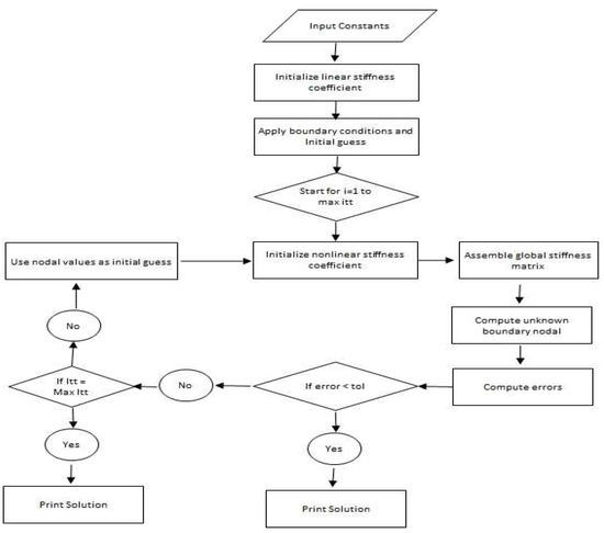 Here and are nodal (unknown) values. The flow chart of this Picard linearisation approach is captured in Figure 2.