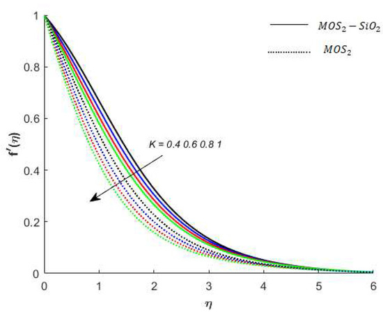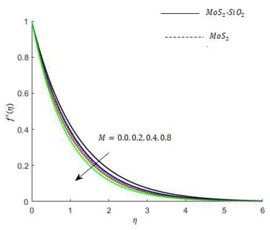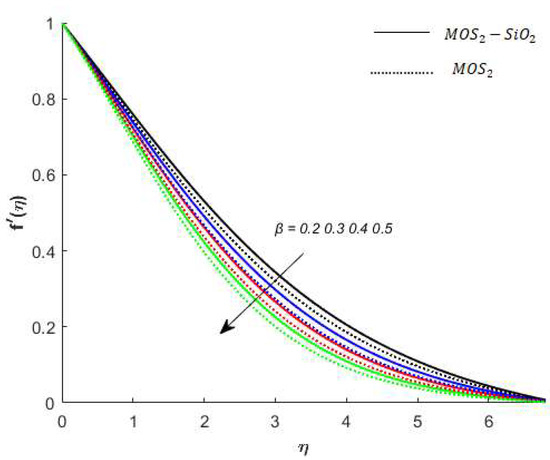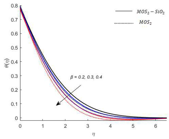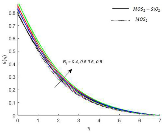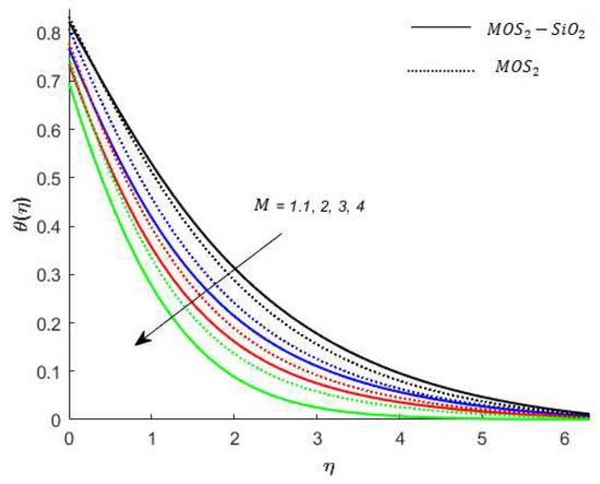 Variation in the velocity of nanofluids under the influences of is presented in Figure 3. Figure 3 reveals that the velocity of the nanofluids is an increasing function of and the reason for this is that when increases, it loosens up the intermolecular forces within the nanofluids and thereby enhances the velocity of the nanofluids. Figure 4 displays the behavior of on the nanofluids’ temperature. It is observed in Figure 4 that the temperature of the nanofluids’ has a direct relation with , which is due to an enhancement in the nanofluids’ volumetric expansion. The effect of on the velocity of nanofluids is displayed in Figure 5. Figure 5 reports that the velocity of the nanofluids is a decreasing function of . Physically, enhances the resistance to nanofluids causing a reduced velocity of the nanofluids. Figure 6 demonstrates the impact of (this parameter appears due to using a Casson liquid in the flow analysis) on the velocity profile of the nanofluids. It is observed in Figure 6 that the velocity of the nanofluids is a decreasing function of . Physically, when is added to the nanofluids, the friction between particles slows. An inverse proportional relation is addressed among the Casson number and the motion of fluid particles. In Figure 1, Figure 2, Figure 3 and Figure 4, it is noted that the velocity profiles of the hybrid nanofluid () is higher than the nanofluid (). Figure 5 and Figure 6 elucidate the impacts of the magnetic field (the magnetic field is called the vector field near the region of the electric field in forces related to where the magnetic field is observed) on the velocity and temperature of nanofluids. It is noted in Figure 5 and Figure 6 that velocity is enhanced with an increase in the magnetic field, while an opposite trend is found in the temperature profile. Physically, the Lorentz force produced due to the magnetic field is in the same direction of the nanofluids’ motion, so the flow boundary layer thickness increases and the thermal boundary layer decreases. Figure 5 also shows that the velocity of the nanofluid () is higher when compared to the hybrid nanofluid (), while an opposite trend is noted in the temperature profile (Figure 6).