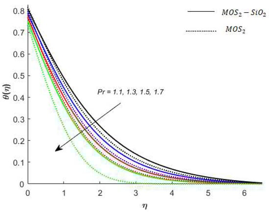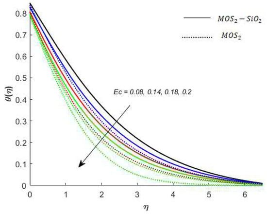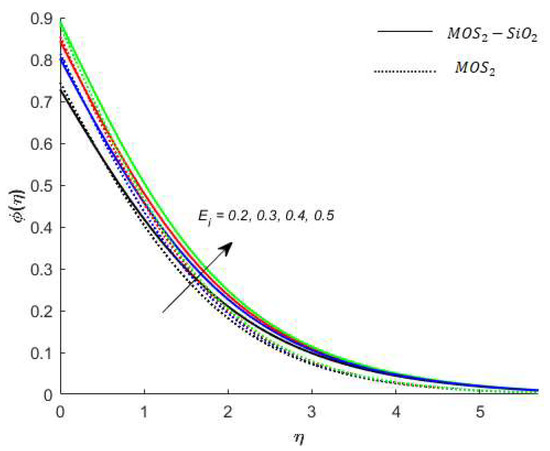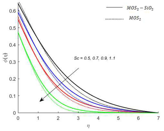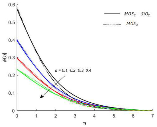 Temperature analysis: Figure 7 demonstrates the effect of (this parameter expresses ration among the enthalpy difference and the flow’s kinetic energy) on the temperature of nanofluids. It is observed from Figure 7, that has an inverse relation with the temperature profile. The reason for this is that the heat transfer rate at the surface increases, thus, the thermal boundary layer thickness decreases with increases in the numerical value of . Figure 8 depicts the impact of on the temperature of nanofluids. The temperature of nanofluids decreases with the increase of . The external heat source has an important impact on the temperature gradient of nanofluids, resulting in a decrement in both the thermal state of the nanofluid and temperature distribution. The variation effect of Bi on the nanofluids’ temperature is plotted in Figure 9. Figure 9 shows that the temperature of the nanofluids’ increases with an increase in the Bi. Physically, the temperature gradient near the surface increases when increasing the numerical values of Bi and hence the thickness of the thermal boundary layer increases. Figure 10 reveals the variation in temperature with the effect of (fractional between momentum to thermal boundary layers). It is noted from Figure 10 that the temperature of the nanofluids’ decreases as the numerical value of is increased. This occurred because the thermal conductivity of the nanofluids’ decreased with an increase in the . Figure 7, Figure 8, Figure 9 and Figure 10 report that the temperature profile is greater in the case of the hybrid nanofluid (). The impact of on the concentration profile is depicted in Figure 11. It is observed from Figure 11 that has a direct relation with the concentration profile. The reason for this is that the impact refers to the mass flux from a lower to greater solute concentration produced by the temperature gradient. The variation in the concentration profile under the influences of is presented in Figure 12. It is observed in Figure 12 that the concentration profile decreased with an increased numerical value of (ratio between mass diffusivity and momentum diffusivity). Physically, the kinematic viscosity increases with an increase in the which turns the molecular diffusion, therefore, the velocity of the nanofluids’ decreases.
