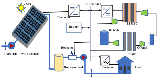Schematic diagram of an IPVFC system including a PV/T, battery, electrolyser and fuel cell [38].