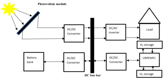 Block diagram of an integrated IPVFC system in which the electrolyser and fuel cell components are replaced with a unitized regenerative fuel cell system [41].