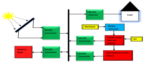 Primarily, the purpose of the integration is to achieve integrated qualities that the subsystems cannot achieve individually. The objectives of integrated energy systems may include increasing the energy and exergy efficiencies, reducing overall cost, improving the reliability of the system, reducing the overall greenhouse gas emissions, et cetera [7,8]. There are various competing power generation methodologies which have recently appeared in the literature. These include hybrid solid oxide fuel cell–microturbine system [8,9], integrated parabolic dish-Rankine-organic Rankine cycle-fuel cell system [10], integrated PV-Fuel cell-wind turbine system [11,12], hybrid solid oxide fuel cell (SOFC)-thermophotovoltaic system [7], integrated PV-wind turbine-battery-diesel system [13], and PV-fuel cell-diesel system. Later, comparisons among these competing technologies are presented in Section 4.