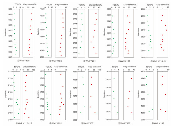 | No. | Well | Number of Samples | Depth (m) | TOC (%) | Quartz Content (%) | Clay Content (%) |