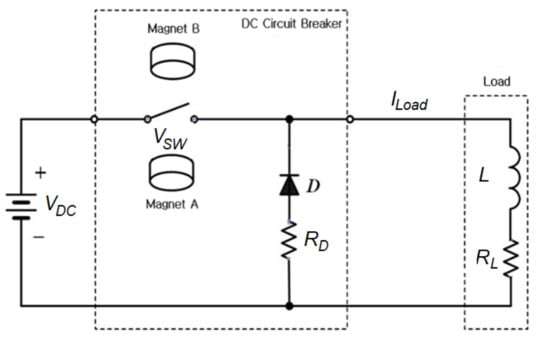 - Kim, Y.; Kim, H. Novel DC Circuit Breaker using Magnet-Extinguisher and Free-Wheel Diode. J. Electr. Eng. Technol. 2019, 14, 497–503. [Google Scholar] [CrossRef]
