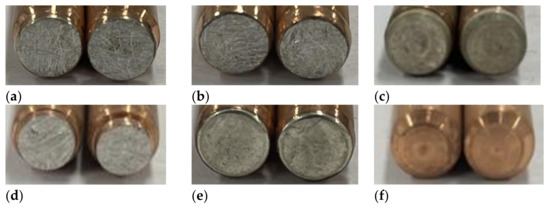Photo of five kinds of samples for the electric contacts tested in this study; (a) AW18-Cu, (b) AgPd, (c) AgW, (d) AgNi-Cu, (e) AgSnO2-Cu, (f) Pure Cu.