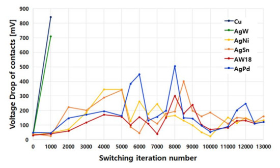 In the 10 A load current condition of Figure 6, when looking at the trend of the voltage drop of the contact according to the electrode material as a whole, life characteristics slightly differ from the 5 A load current condition. That is, the voltage drop value for each electrode material during the initial operation was in the range of 8 mV to 20 mV under the 5 A load current condition, but it becomes 2.5 to 4 times greater under the 10 A load current condition as 30 mV to 50 mV. In addition, the magnitude of the voltage drop of the contact point according to the four electrode materials shows a greater deviation from 24 mV to 506 mV in the repeated operation periods of up to 11,000 cycles. This means that the maximum voltage drop between electrode contacts is increased by about 20% compared to the 400 V/5 A load current conditions.