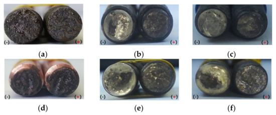 Figure 7 shows the state of contact surfaces according to electrode material during repeated operation (10,000 times) under the 10 A load current condition. AgW and pure copper contact materials are burnt due to severe carbonization of both the (+) and (−) electrodes, whereas the other contact materials are not severely burnt at the (+) and (−) electrode.