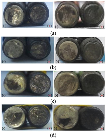 Comparison of deterioration of each electrode material in repeated operations, 10,000 (left photo) and 13,000 (right photo), under the 10 A load current condition, (a) AgNi-Cu, (b) AgSnO2-Cu, (c) AgPd, and (d) AW18-Cu.
