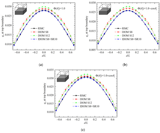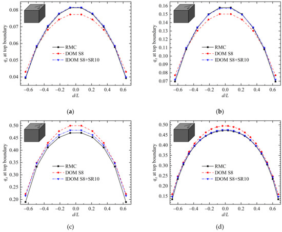 Figure 7 shows radiative heat flux distribution at top boundary in Case 3 with different optical thicknesses. As shown in Figure 7a,b, when optical thickness is 1.0 and 2.0, heat flux by the IDOM is in good agreement with the benchmark solution and the average errors are only 0.83% and 0.79%, while the average errors of heat flux by DOM are 3.54% and 3.75%. These results show that the IDOM can significantly reduce false scattering error comparing with the conventional DOM.