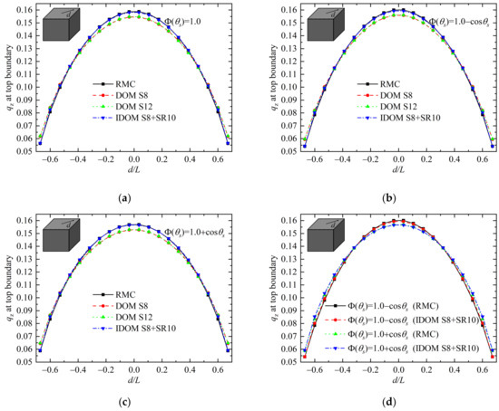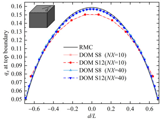 Heat flux at the top boundary in Case 2 is displayed in Figure 4. In this case, the enclosed medium is absorbing and scattering with optical thickness βL equal to 2.0. The bottom half of the medium is hot with a unity emission, while the top half and all boundaries are cold. As displayed in the figure, both DOM S8 and DOM S12 suffer from obvious ray effects due to the non-uniform emission of the medium. Their calculation results are significantly larger than the benchmark solution, and the average errors are larger than 8.2%. In contrast, heat flux calculated by IDOM S8 + SR10 is in good agreement with the benchmark solution and the average error is less than 1.4%. The above results once again show that IDOM can effectively reduce the error of ray effects and significantly improve the accuracy of radiative heat flux.
