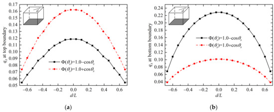 Heat flux at the boundary of Case 3: (a) results for A1 = 0; (b) results for A1 = −1; (c) results for A1 = 1; (d) results comparison for A1 = −1 and 1.