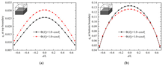 Heat flux with different scattering phase functions in Case 1: (a) results at top boundary; (b) results at bottom boundary.