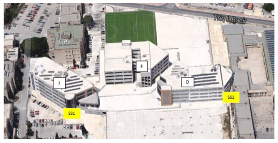 With Blocks D, J, and F and its underground parking, the MCAST micro-grid covers an area of around 40,000 m2 of the overall MCAST campus. The main feeder at Substation 1 (SS1) is connected to the utility grid, which Enemalta PLC maintains through a Medium Voltage (MV, 11 kV) switchgear. This voltage is then stepped down to 400 V using a step-down transformer. SS2 is connected from SS1 by an interconnection feed using a ring configuration and then stepped down to 400 V. Thus, SS1 mainly feeds Block J while SS2 feeds Blocks D, F, and the Underground Parking, as shown in Figure 2.