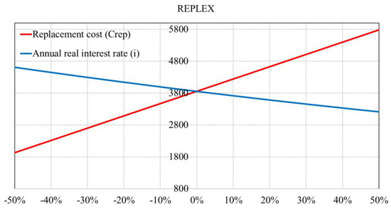 Figure 32 displays the sensitivity analysis carried out on the REPLEX of the PV system over a 30-year life span. In this analysis, the life span of the PV inverter is assumed to be 15 years, whereas the BESS is to be replaced every ten years. To carry out the sensitivity analysis on the REPLEX, different discount rates are applied to the replacement cost by fixing the interest rate at 7%. Thereafter, the REPLEX behavior is observed for different annual interest rates. It is seen that the variation in REPLEX due to annual interest is smaller as compared to the variation due to replacement cost. Hence, the replacement cost is the prominent factor in deciding the REPLEX.