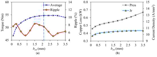 The influence of the stator geometric parameters, shown in Figure 35, on some major performance characteristics is parametrically investigated in this part. Note that the determined individual optimum values of each stator slot parameter are indicated in the related figures. Figure 37 shows the effect of the stator slot opening parameter on the torque, torque ripple, stator copper loss, and current density. The peak torque is achieved at 1.8 mm of and the torque ripple reduces remarkably as is increased. On the other hand, since has no effect on the stator slot area, no considerable change in the stator copper loss and current density is observed. The insignificant reduction in the stator copper loss is due to the slightly reduced harmonic content of the stator current.