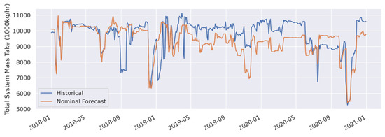 | Total System Mass Take (1000 kg/h) | Nominal Forecast | 783 | 8.1 | −328.4 | −3.4 |
