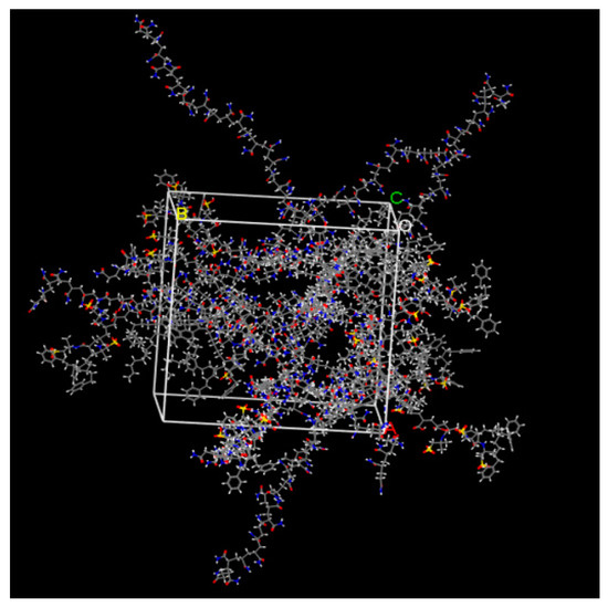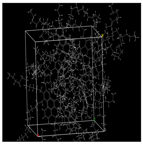 In this study, the molecular models of AM, AA, AMPS, and PB were established in 3D Atomistic document. The structure and performance of the obtained copolymers were optimized from three distinctive aspects including, energies, geometries, and dynamics in the Forcite calculation module to ensure the consistency in molecular structure and performance of copolymer with the desired one as depicted in Figure 4. After designing and optimizing the copolymers molecular structure in the polymer builder tools, the mole ratio of AM:AA:AMPS:PB = 30:2:3:3, chain length of 10, and chain segment of 1 were then obtained. Subsequently, the Amorphous cell module (temperature of 333 K and number of cycles of 10) was employed to establish the viscosity reducer model and the calculation was carried out using Forcite analysis. The dynamic simulation of viscosity reduction mechanism of copolymer in heavy oil was therefore established. The simulation was performed in the Compass force field using the ratio of heavy oil to viscosity reducer of 1:1, the temperature was controlled at 333 K, with cycle number of 10, and the optimized spatial structure of the interaction between viscosity reducer and heavy oil was obtained as represented in Figure 5.
