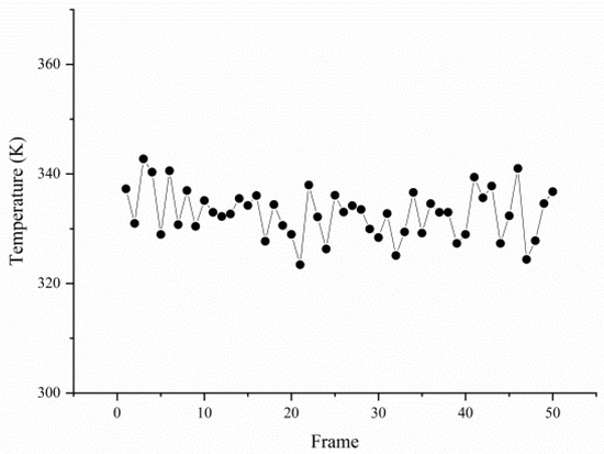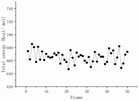 As earlier described in Section 2.2.2, both temperature variation and total energy variation were simulated during the synthesis process of viscosity reducer, and a total of 50 dynamic models were acquired as indicated in Figure 6 and Figure 7. From the curve of temperature variation represented in Figure 6, it can be observed that the temperature fluctuated in small range close to the set synthesis temperature (333 K), which revealed that the set temperature of the periodic system had little influence on the simulated results. The curve of variation of the total energy was also presented in Figure 7. It was found that, at a fixed reaction temperature of 333 K, the total energy of the system also slightly fluctuated within a small range. We could not only observe that this fluctuation occurred around 670 kcal/mol, but also the energy of C-C double bond was 145.7 kcal/mol, inferring that under this reaction condition, the rupture of C-C double bond could be envisioned, and the polymerization reaction was therefore theoretically feasible.