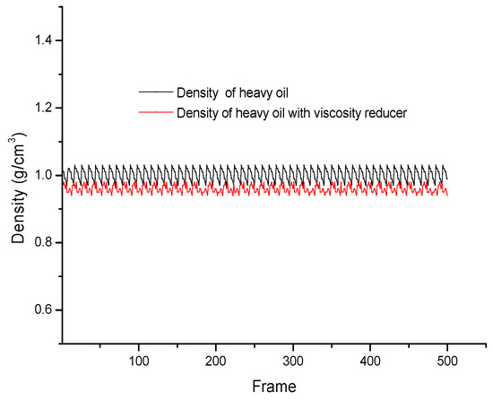As it can be observed in Figure 8, compared to the corresponding curve of heavy oil, that of the viscosity reducer with heavy oil significantly increased. This sharp variation in potential energy could be due to the attachment of asphaltene and resin molecules to the viscosity reducer which resulted in the forming of a large spatial steric hindrance which was constituted of an abundant number of branched-chain structures of the viscosity reducer molecules. It can be inferred that the viscosity reducer molecules which was constituted of a sulfonic group, carboxyl group, and hydrophobic structure with benzene ring mutually induced strong adsorption of benzene ring structure in asphaltene and colloid molecules. From the same Figure, we could also observe an obvious increase in negativity of non-potential energy which might be attributed to the two strong polar monomers (AA and AMPS) as a consequence of intensifying the interaction between the viscosity reducer and inward of heavy oil. As a matter of fact, the strong hydrophilicity of the sulfonic group in AMPS was beneficial to maintain the O/W emulsion via the formation of more stable hydrogen bonding. Subsequently, the network structure was gradually disassembled from the “inward” to “outward” of the heavy oil structure. Under such circumstances, the long carbon chain in AMPS, asphaltene, and colloid molecules were longitudinally extended resulting in the formation of planar and easily combed linear structure, thus preventing the occurrence of three-dimensional assembly structure and eventually the viscosity reduction. From Figure 9, it was noticed that the overall density of both heavy oil and viscosity reducer with heavy oil fluctuated within a small range. However, compared to the overall density of heavy oil (1.00 g/cm3), that of the viscosity reducer with heavy oil (0.96 g/cm3) was slightly lower, translating that the asphaltene and colloid compounds in heavy oil were removed. Thus, this phenomenon contributed not only to lowering the density of heavy oil, but also the declining of heavy oil viscosity could be envisioned (which will be investigated later).