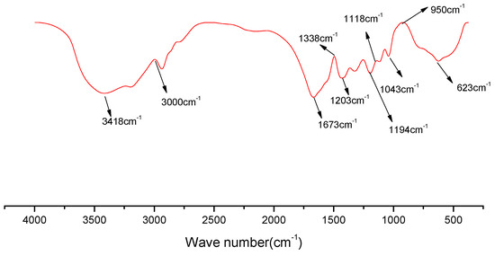 Figure 11 shows the FT-IR spectra of viscosity reducer. The large band at 3417.77 cm−1 corresponded to the stretching vibration of N-H in amide. The stretching vibration of C=O in amide was assigned to the peak at 1673.39 cm−1. The peak observed in the range of 1337.71–1045.62 cm−1 was attributed to the stretching vibration of C-N in amide. The COO− in the acrylic acid vibrated at 1554.38 cm−1. The three adsorption peaks recorded at 1194.10 cm−1, 1118.10 cm−1, and 1042.6 cm−1 were ascribed to the SO3− groups in AMPS [36]. The broad absorption peak noticed at 622.54 cm−1 was due to the absorption characteristic of benzene ring. In the light of these results, the four monomers were involved in the copolymerization reaction.