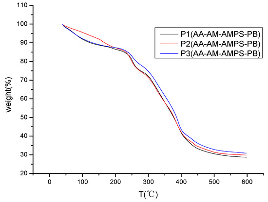 The TGA analysis curve of viscosity reducer and polyacrylamide taken from room temperature to 600 °C in N2 atmosphere was displayed in Figure 12. The first region below100 °C with a large slope was ascribed to elimination of water molecules and unreacted monomers. The initial decomposition temperature was recorded as 250 °C, while that of polyacrylamide was 210 °C [36], suggesting that the viscosity reducer had superior temperature resistance. This was mainly due to introduction of benzene ring structure of PB and sulfonic group which contributed to improve the thermal stability of viscosity reducer, thus indicating that the viscosity reducer could find use in high temperature heavy oil formation.
