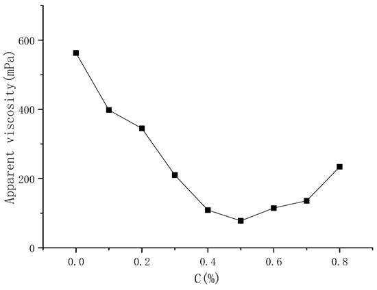 In order to ensure the fluidity of heavy oil, the experimental temperature was maintained at 70 °C, distinctive concentration of P2 solutions was added into the heavy oil and the final viscosity was taken. Figure 13 revealed the contribution of viscosity reducer concentration on the viscosity of heavy oil. As it can be observed, with increasing P2 concentration from 0 to 0.5 wt.%, the viscosity of heavy oil dropped by almost 86.14%, as to reflect its favorable viscosity reduction effect. As a matter of fact, the viscosity reducer (P2) had a low molecular weight and sufficiently long molecular chain. Moreover, the molecular structure of P2 was composed of strong polar groups COO− (AM, AA) and SO3− (AMPS), which aided the migration of P2 into the ‘inward’ of heavy oil as a consequence to disassemble, but also to effectively oppose the water molecules from entering the internal structure. Thus, the O/W structure predominated over the W/O one as a consequence to favor the fluidity of heavy oil. In this way, the benzene ring structure which constituted the P2 molecular structure was well embedded in the asphaltene interlayer [37]. From the same plot, we could notice that increasing the P2 concentration contributed to gradually increase the apparent viscosity of heavy oil, which might be due to entanglement of the long chain of viscosity reducer in the O/W emulsion.