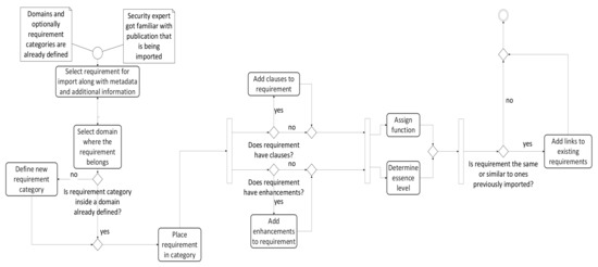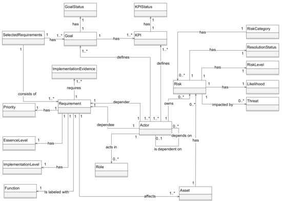 It has been estimated that an error that is not identified and corrected in the requirements phase can cost a lot more to correct in subsequent phases [58]. This is also applicable to security requirements. A mitigating circumstance is that standards and guidelines already have a well-defined set of requirements, and the real challenge is shifted from the interpretation of the requirements to their implementation. As the main idea of the paper is to define a comprehensive model for the representation and tracking of compliance with security requirements based on widely used security standards, proposing a plain model of the security requirements purely based on the entities extracted from the previous section is not sufficient. Further fine-grained connections between those entities have to be defined. Since the model is aimed at security practitioners in companies, the relationship among them—the social actors—needs to be added. This changes the usual perspective of a strict organization or system-oriented requirements interpretation.