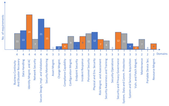 After the selection of the publications, an in-depth review of the security requirements of each was performed to find similarities based on which elements of the model could be extracted. There had to be a defined point of view that was suitable to approach the analysis systematically. This is necessary since direct mapping between two publications is more than challenging. For instance, if we were to compare NIST SP 800-53 and ISO/IEC 27001, we would have ISO/IEC 27001 controls that do not fully satisfy the intent of the NIST controls [44]. When more than two publications are compared, the job is more demanding since the expectation is that security requirements from different publications, if satisfied, should have to result in equivalent security posture in the end. Comparing two by two requirements for each pair of publications is not scalable at all. One common prism through which security requirements can be analyzed is defined within the NIST Cybersecurity Framework (CSF). The CSF is a risk-based approach to managing cybersecurity risk and is composed of three parts: the Framework Core, the Framework Implementation Tiers, and the Framework Profiles [45]. The requirements are grouped by five functions that Framework Core defines to provide a high-level, strategic view of the lifecycle of an organization’s management of cybersecurity risk: identify, protect, detect, respond, recover. CSF defines 23 domains (or categories, dimensions, or areas of knowledge) that are arranged in these functions. Categories are not fixed, and the framework allows for category extension and adjustment as in [46]. Conversely, the US Department of Homeland Security (DHS) issued a control system security report that broadly classified security sub controls into two categories—organizational sub controls that cover different security policies, organizational and personal security, and operational sub controls that cover different activities such as system acquisition or configuration management [47]. Other approaches define different numbers of domains for security requirements classification. For example, papers [27,48,49,50,51] define 26, 19, 18, 10, and 17 domains, separately. In addition, selected publications NIST800-53, IEC 62443 3-3, ISO/IEC 27001, and NERC CIP differentiate another 20, 7, 14, and 12 (with an additional 4 that are subject to enforcement in the future), respectively.
