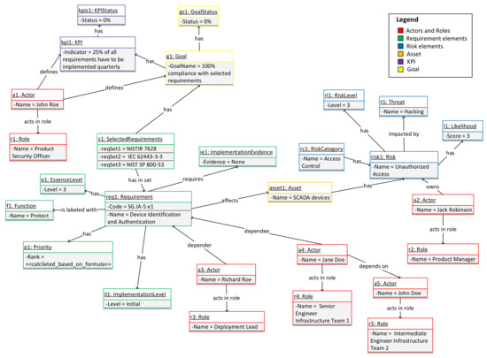 For the initial population of the requested information based on the conceptual model, SG.IA-5 e1 requirement is given in Figure 7. For better readability, the number of assets and risks in Figure 7 is reduced and simplified. Here, we have enough information to see what the goal of the exercise is, how it is measured, which assets and actors are involved, and their dependency chain, as well as associated risks. By repeating these steps for each requirement, using Formula (1) we can calculate the priority for requirement implementation.