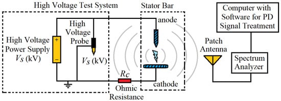 High sinusoidal voltage is produced by a generator, which induces a high electric field in the rotating machine and surroundings, including the air, the electrical insulation materials and surfaces of the generator structure. Therefore, PDs can be associated with several problems, including dielectric rupture of gases confined in stator bar insulation internal voids, the degradation of the semiconductive layer due, for instance, to mechanical or electrical stresses, and the presence of undesired objects in the stator winding [2]. Discharge activities evolve gradually over the years, which can be identified and quantified by measuring acoustic emissions [4,5], electrical PD signals [6,7], and electromagnetic radiation [8]. If the electrical problems PDs indicate are not monitored and treated, they can evolve to reach a state of complete unavailability of the hydro-generator [2,9,10,11].