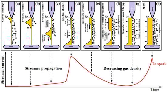 The electrical connection between the electrodes (Figure 2d), due to the ionized air filament, gives rise to a process leading to the so-called spark breakdown discharge [26]. This attachment instability precedes the formation of a secondary streamer, which consists of a progressive enlargement of the channel cross-section area due to a rise in temperature associated to the fast current increase produced by the high voltage from the source fully applied between the two ends of the channel. This process evolves into an equipotentialization state along the residual streamer channel (see Figure 2e–g). The secondary streamer is visually observed as a partial re-illumination of the streamer channel, usually starting at the anode at almost the same time that the streamer head makes contact with the cathode. The secondary streamer starts and moves in the channel created by the previous ionization processes, and although the increase in the channel cross-section area favors reducing and the electrical conductivity as a consequence, the concurrent exponential decay of the current in the channel is also significantly dependent on the attachment of electrons to oxygen molecules [26].