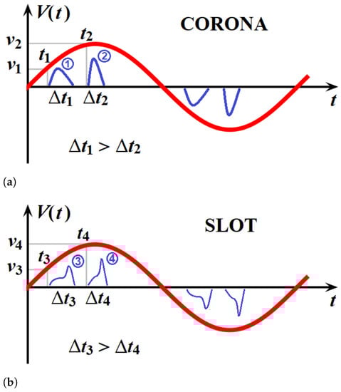 Ilustrations of partial discharges in a sinusoidal voltage signal: (a) corona and (b) slot.