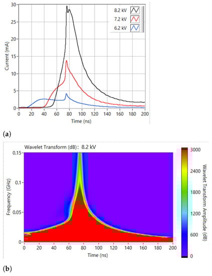 Discharge current pulses: (a) evolution of waveforms over time (8.2 kV, 7.2 kV and 6.2 kV pulses) [25], (b) wavelet transform of the 8.2 kV pulse, (c) wavelet transform of the 7.2 kV pulse, and (d) wavelet transform of the 6.2 kV pulse.