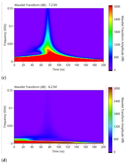 Figure 4a shows the discharge currents obtained in [25] using 8.2, 7.2, and 6.2 kV voltage excitation levels. Figure 4b–d shows wavelet transforms, calculated in this work, of PD current pulses in Figure 4a. Note that the higher the excitation voltage, the higher are the discharge current pulses and the shorter the time intervals necessary for current to reach its peak. Consequently, their spectral bands become larger, especially during the time periods of steep current slopes, as can be easily seen by comparing the wavelet transforms to each other and by observing their respective current signals evolving over time in Figure 4. Wavelet transforms in Figure 4 were calculated by numerically evaluating , in which t is time, , f is frequency, is the time shift factor, and (the real-valued Morlet wavelet) [30].