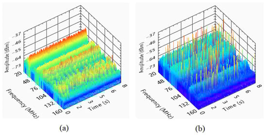 Spectrograms of (a) corona and (b) slot partial discharges. The spectrograms were registered in this work within eight seconds between 20 MHz and 160 MHz.