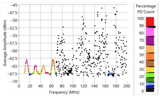 Based on this experimental confirmation of the theoretical prediction, we developed in this work the Frequency Resolved Partial Dischage (FRPD) map (which is based on the developed Partial Discharge Spectral Pulse Counting technique), of which an illustrative example is shown in Figure 6. FRPD and its classification capabilities are the main contributions of this paper. In a short explanation, we may say that the map in Figure 6 is constructed by detecting pulses with amplitudes that are higher than a pre-established power threshold in the time-frequency domain (Figure 5) by counting the repeating pulses over time for each defined small registering frequency window and by averaging the amplitudes of the registered pulses in each registering frequency window. Normalized (percentage) spectral PD counting levels are represented by the colors of the dots in Figure 6.