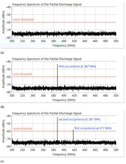 Spectral registering of PD pulses obtained at different times: (a) measurement with no occurrence records, at t = t0; (b) detection of the first occurrence at 387 MHz, at t = t1; and (c) detection of the second occurrence at 387 MHz and of the first occurrence at 417 MHz, at t = t2.