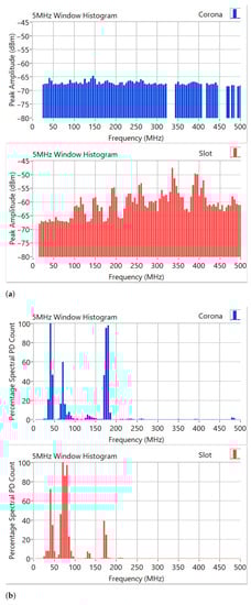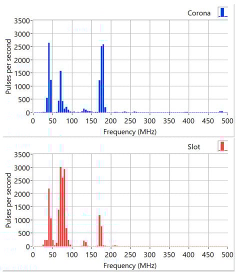 The situation is different when FRPDs are used for identifying the measured corona and slot PDs. FRPDs seen in Figure 14 show spectral counting computed from 0 to 500 MHz for different cases: corona discharges in Figure 14a, slot discharges in Figure 14b, and corona PDs with simultaneous slot PDs in Figure 14c. In order to quantify background noise and to map radiated signals from the high voltage source, we have registered the background noise with non-energized and energized high voltage power source, as shown by Figure 14d,e, respectively.