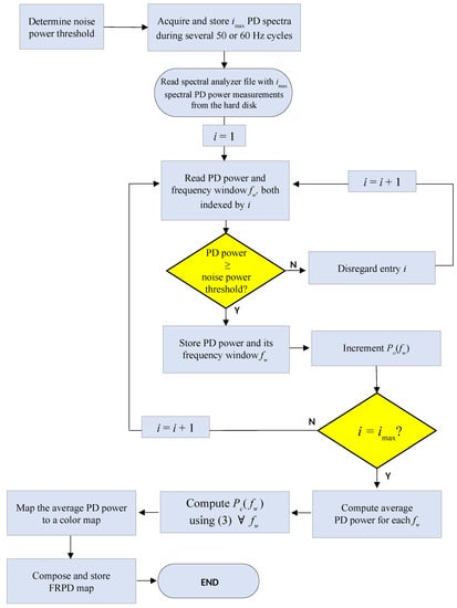 Computer implementation of FRPD is based on two one-dimensional arrays: one array for PD count and another for average PD amplitude, computed using peaks crossing the power threshold for each frequency window individually. The dimensions of both arrays are coincident with the number of employed frequency windows.